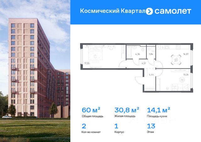 Строим кварталы для жизни с заботой о будущем. Предлагается 2-комнатная квартира комфорт-класса 60,03 кв.м в корпусе 1 на 13 этаже, в ЖК "Космический Квартал" Квартира с чистовой отделкой. Доступность дополнительных опций уточняйте у застройщика. Приобрести квартиру возможно по специальным акциям от застройщика, с текущими условиями акций можно ознакомиться в блоке "Акций". Цена динамическая и может отличаться, уточняйте актуальность у застройщика. "Космический Квартал" находится в Московской области, в Королеве. В Королеве находятся несколько парков и лесов, а реки Клязьма и Яуза окружают наукоград с двух сторон. Путь до Москвы будет быстрым и удобным: до МКАД — 20 минут на автомобиле, а до ж/д станция Болшево - 8 минут на авто или 20 минут пешком. В проекте предусмотрены собственный детский сад, многоуровневые паркинги, а также магазины, спортзал, ресторан и аптеки на первых этажах домов. Неподалеку от квартала находятся городские гимназии 3 и "Ковчег" и лицей 4. "Космический Квартал" — это 3 монолитных дома высотой 12-17 этажей. Во внутреннем приватном дворе-парке будут детские и спортивные площадки. А для занятий спортом будут обустроены воркаут-пространства. Все подъезды — с безбарьерным входом. В лобби есть помещения для велосипедов и колясок. На техническом этаже — индивидуальные кладовые для сезонных вещей. Продуманные планировки от небольших студий до просторных 4-комнатных квартир с гардеробной, постирочной и гостевым санузлом. Квартиры сдаются как с отделкой, так и без нее.