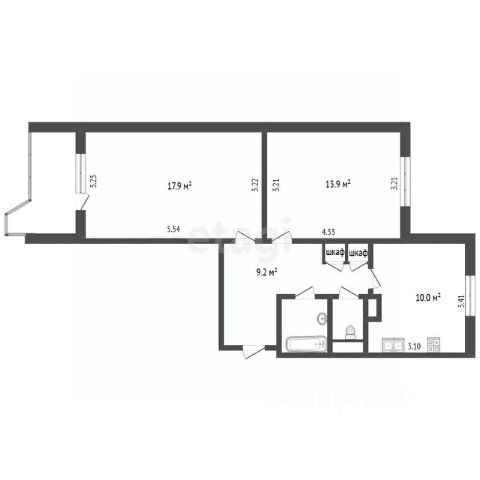 Изолированные комнаты: 32,1 кв.м. (18,0 и 14,1) - "распашонка"