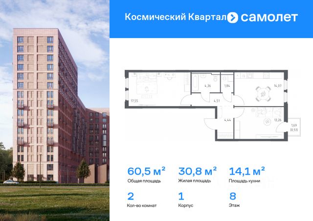 Общая площадь 51 метр, 2 изолированные комнаты: светлая спальня 14,5 метров с встроенным шкафом-купе, уютная детская 20 метров, просторная кухня-гостиная 9 метров, раздельный санузел, прихожая с встроенным шкафом-купе.