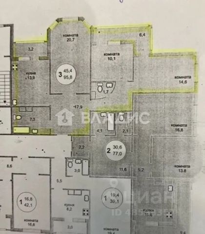 - жилая площадь 41,6 метр, две изолированные спальни 12.5 метров, 10.2 метров, смежная гостиная 18.9 метров, которую можно изолировать и оборудовать гардеробную в коридорной зоне;