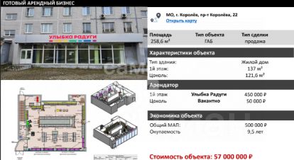 ==ЛОТ 223155 == ОТ СОБСТВЕННИКА, БЕЗ КОМИССИИ. Арендный бизнес, показатели: МАП (месячный арендный поток) 500000руб. ГАП 6000000 руб. Продается помещение общей площадью 258. 6 кв. м ( 137 кв. м первый этаж и 121. 6 кв. м цоколь ) с Арендатором - Улыбка Радуги (...