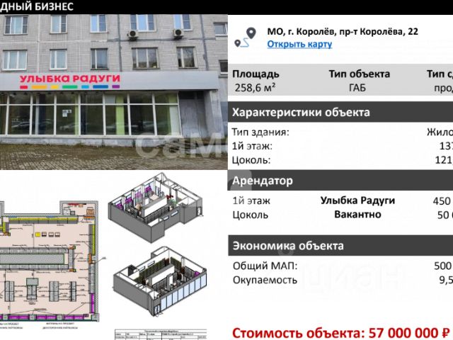 Предлагается в продажу готовый Арендный бизнес с арендатором "Улыбка Радуги" по адресу: Московская область, МО, г. Королёв, пр-т Королёва, 22.