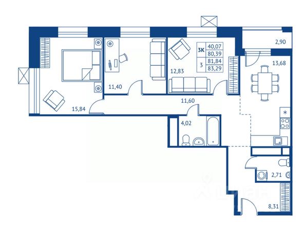 Общая площадь составляет 77,9 кв.м. (включая лоджию 4 кв.м.), смежно-изолированные комнаты 18.9/14.8/11.2 кв.м., кухня 10,2 кв.м., раздельный санузел.
