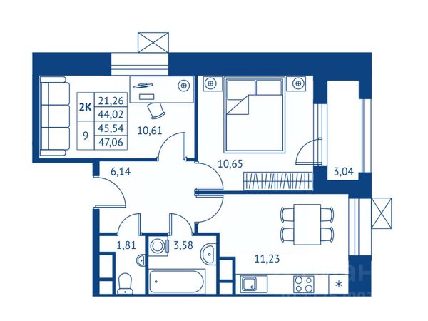 Общая площадь 31.4 метр (по БТИ), комфортная комната - 17 метров, функциональная кухня - 10,5 метров, совмещенный санузел, окна ПВХ.