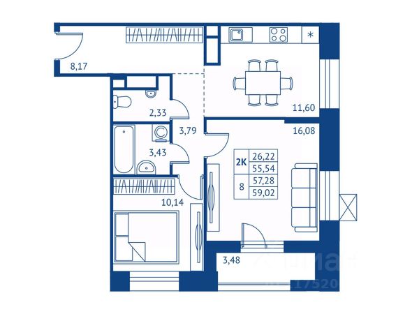 Общая площадь квартиры: 58,3 кв.м (высота потолка 275 см)