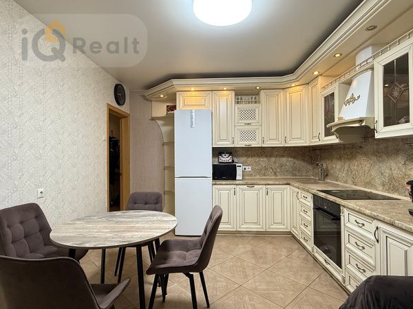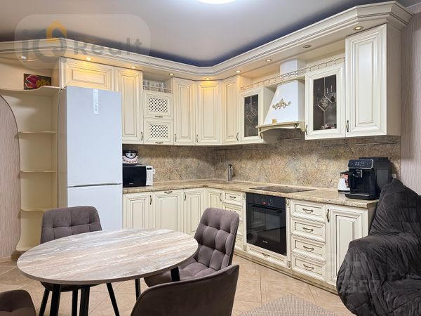 Свежий, красивый ремонт в ванной комнате. Два просторных балкона: один в зале, другой в спальне, окна которой выходят на улицу. На кухне обеденная зона также с большими окнами и с красивым видом (особенно летом). Кухня из массива с барной стойкой.