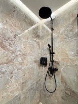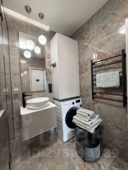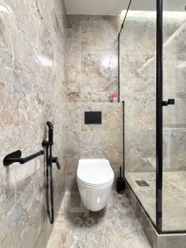 В санузле душевая кабина с трапом и душевой гарнитурой с термостатом, стиральная машинка, подвесной унитаз с гигиеническим душем, раковина со смесителем, стильный фен. В шкафу есть все необходимые гигиенические принадлежности, включая одноразовые щетки, шампуни, кондиционеры, предметы гигиены и тд
