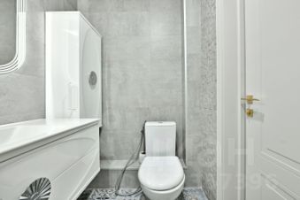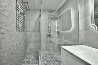 Просторный санузел с современной душевой кабиной и качественной сантехникой.