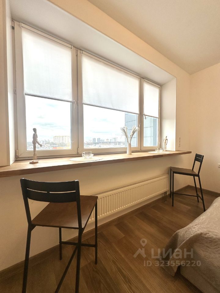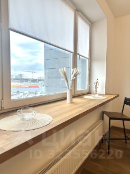 Удобный рабочий стол у окна, выполненный из дерева, идеально подойдёт для ноутбука, завтрака или чашки кофе с видом на город.