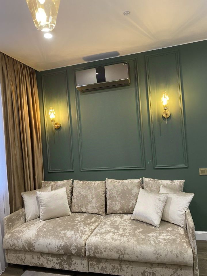 В студии выполнен дизайнерский ремонт, что придаёт помещению современный и стильный вид. В квартире есть вся необходимая мебель как на кухне, так и в жилой зоне, а также полноценный набор техники: кондиционер, холодильник, телевизор и стиральная машина. В ванной комнате установлена душевая кабина. Окна выходят во двор, что обеспечивает тишину и спокойствие.