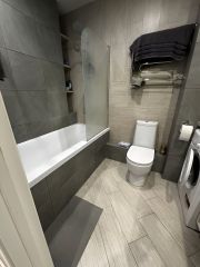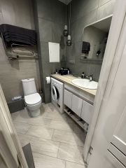 Санузел совмещенный, оформлен в современном стиле с качественной сантехникой и стиральной машиной. В прихожей предусмотрены вместительные шкафы для хранения вещей.