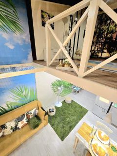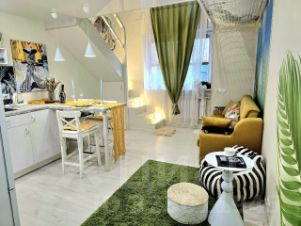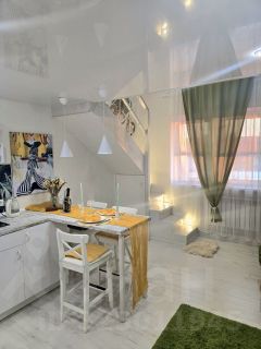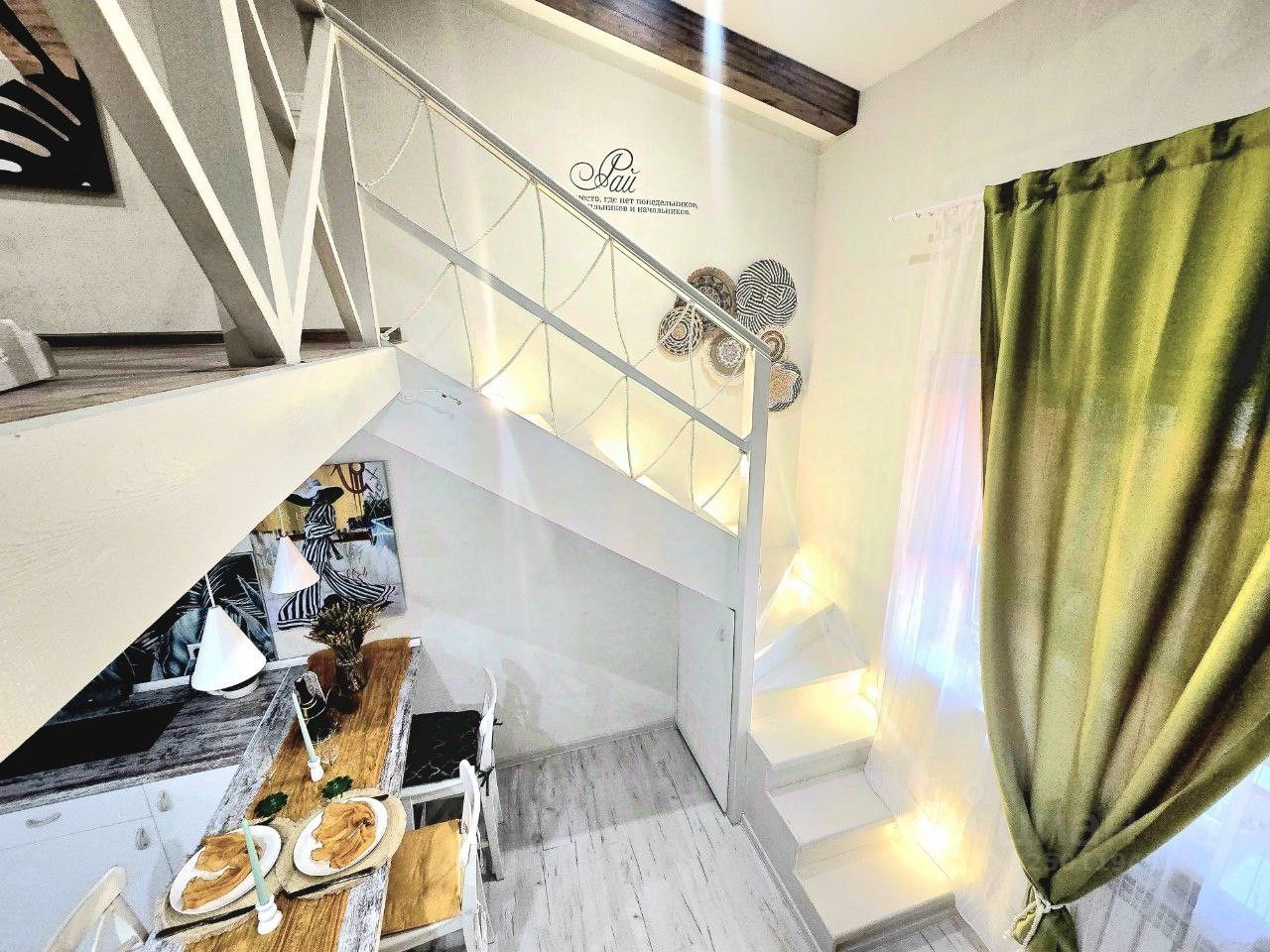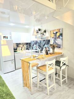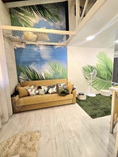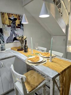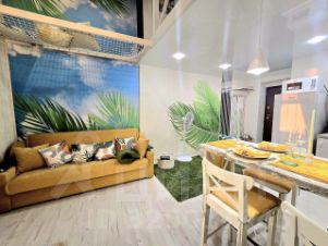 Квартира расположена на 4 этаже. Общая площадь квартиры 41 м2 с учетом 2 этажа. На 1 эт. гостиная, кухня, санузел, на 2 эт. спальная зона, гардеробная ниша, гамак для отдыха. В квартире есть вся необходимая мебель и техника для жилья.