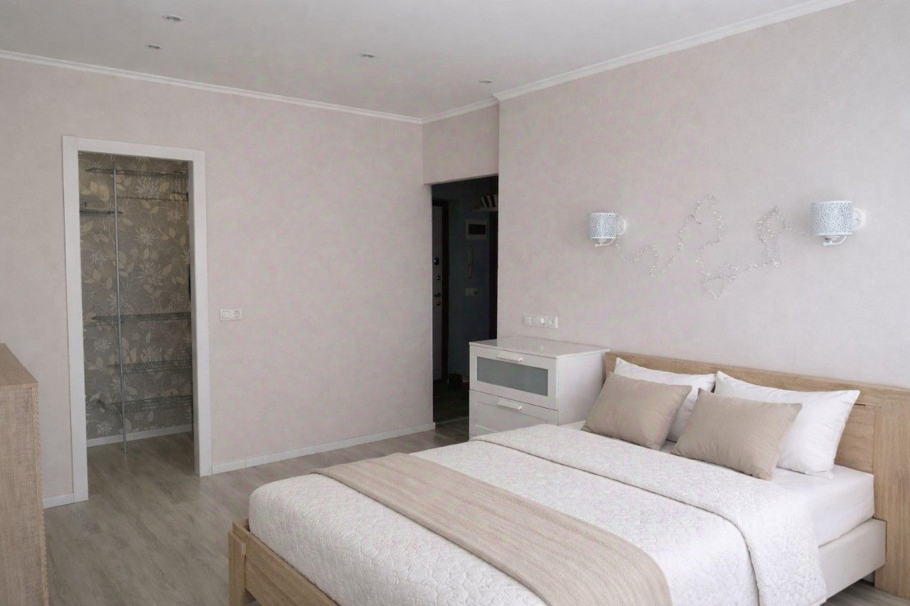 Спальня-релакс: удобная двуспальная кровать с мягким изголовьем и стильные тумбы. Отдельная вместительная гардеробная позволит спрятать всё лишнее, оставив в комнате только воздух и уют.