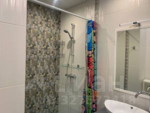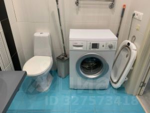Стильный совмещенный санузел с современной сантехникой, душем и стиральной машиной-автомат.