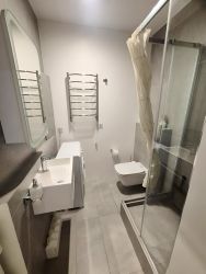 В квартире выполнен дизайнерский ремонт и установлена вся необходимая мебель, как на кухне, так и в комнате. Здесь есть все для комфортного проживания: холодильник, посудомоечная машина, телевизор и стиральная машина. Санузел совмещенный, оборудован современной душевой кабиной. Окна выходят на улицу, обеспечивая достаточное количество естественного света.