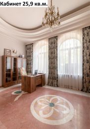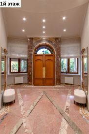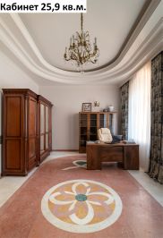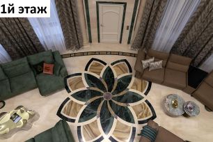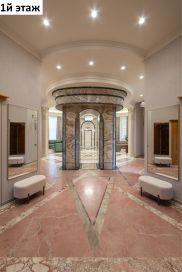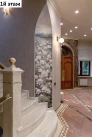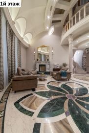 Роскошный интерьер в стиле современной классики. Полы из натурального камня в общих зонах, художественный штучный паркет в жилых помещениях, ванные комнаты, отделанные натуральным камнем, и эксклюзивные рукописные фрески — всё это подчёркивает высокий статус и безупречный вкус.