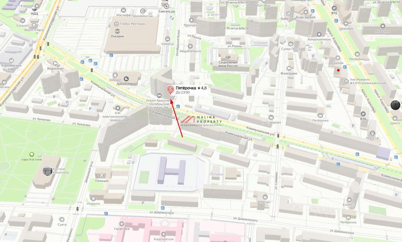 Продажа торгового помещения 460,8 м2 с арендатором супермаркет "Пятерочка" в г. Королёв, Октябрьский бульвар, д. 26 (25 минут транспортом от метро Медведково). 1 линия домов.