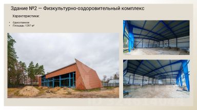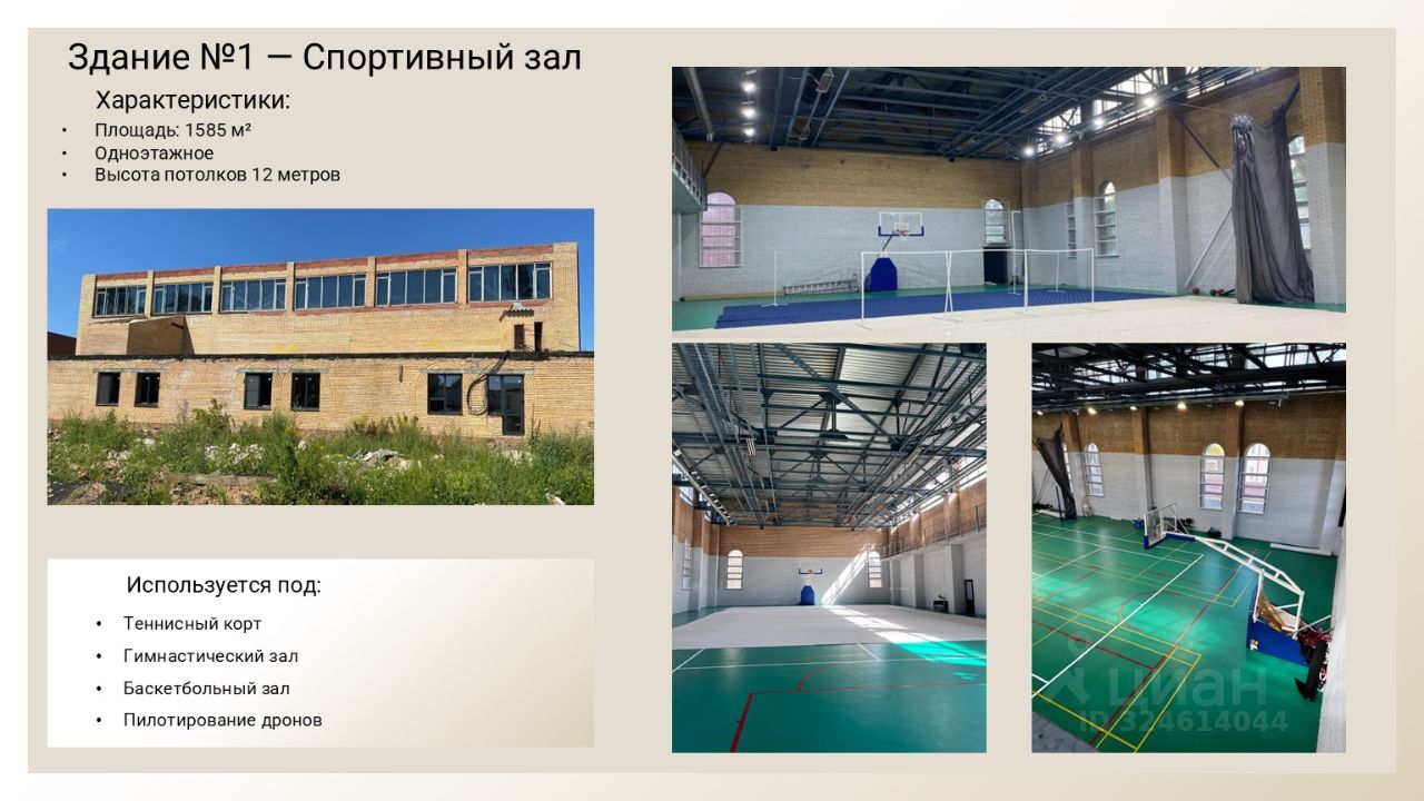Здание - площадь 1585,2 м2, 1 этаж и 1 подземный этаж , здание действующее - спортивный зал с раздевалкой, санузлом