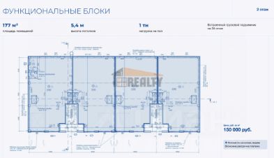 177 м² на первом этаже: Высота потолков — 5,4 м на каждом этаже. 177 м² на втором этаже.