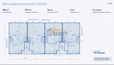 Комплекс включает 4 здания по 1 420 м², каждое делится на 4 блока по 355 м².
