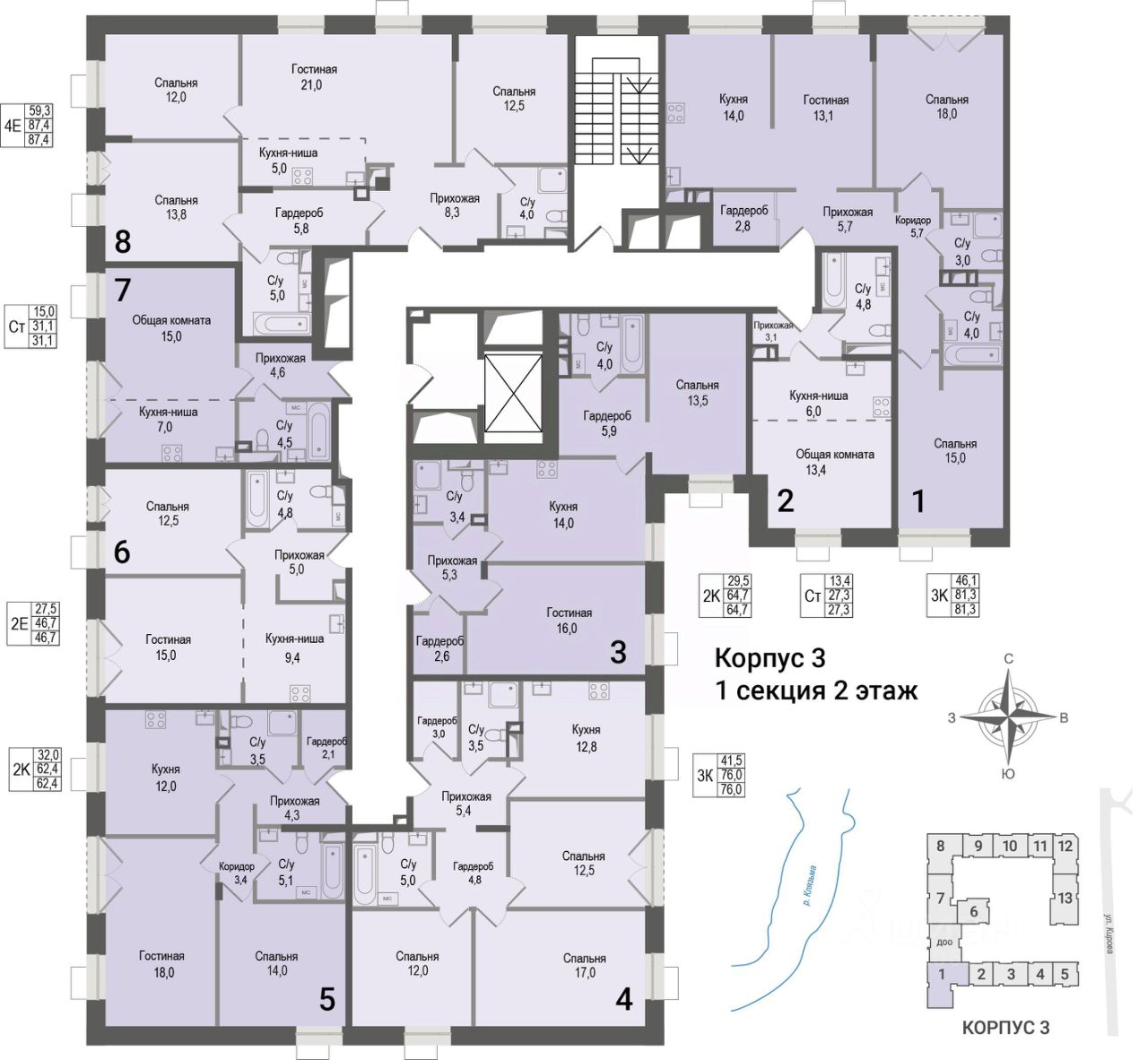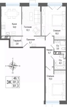 Продаётся 3-комнатная квартира в строящемся доме (Корпус 3), срок сдачи: II-кв. 2027, общей площадью 81.3 кв.м., на 2 этаже. ЖК "Киноквартал" , МО, г. Королев, мкр. Первомайский, ул. Солнечная, д. 2