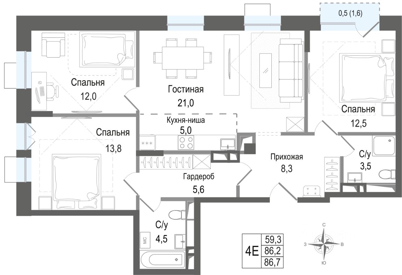 Продаётся 4-комнатная квартира в строящемся доме (Корпус 3), срок сдачи: II-кв. 2027, общей площадью 86.2 кв.м., на 4 этаже. ЖК "Киноквартал" , МО, г. Королев, мкр. Первомайский, ул. Солнечная, д. 2