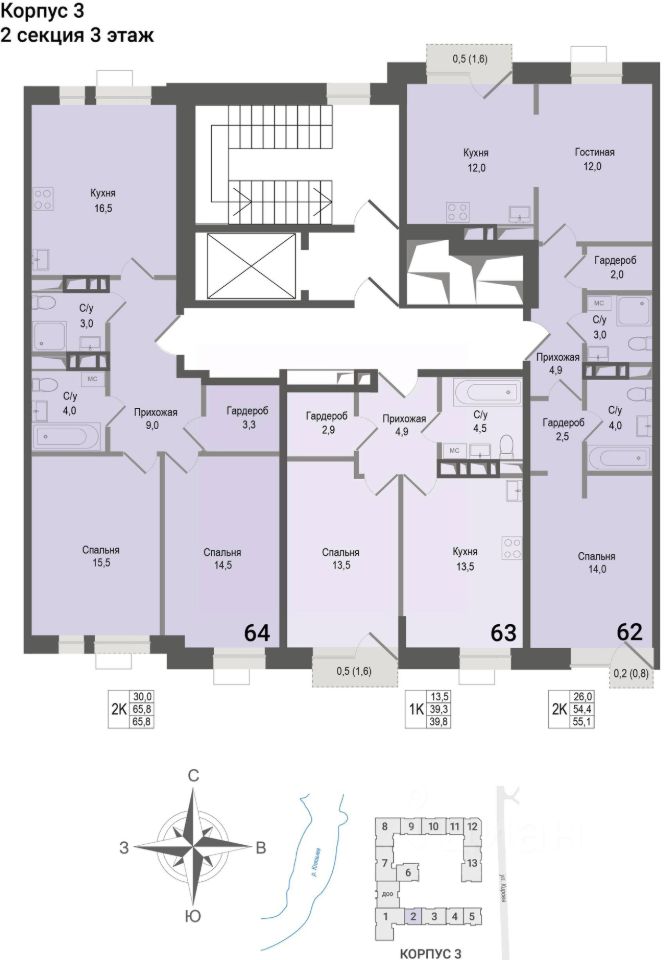 Продаётся 2-комнатная квартира в строящемся доме (Корпус 3), срок сдачи: II-кв. 2028, общей площадью 54.4 кв.м., на 3 этаже. ЖК "Киноквартал" , МО, г. Королев, мкр. Первомайский, ул. Солнечная, д. 2