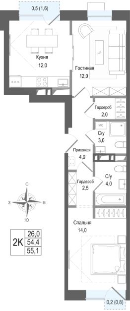 54,4 м²