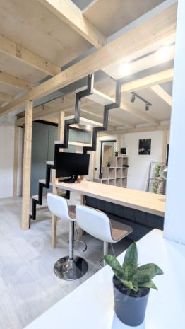 - Два уровня удобное зонирование: внизу; кухня-гостиная и санузел, наверху уединённая спальня;