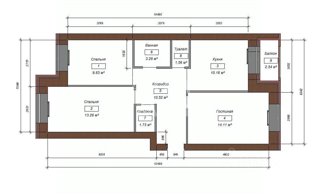 В квартире три изолированные комнаты площадью 14,11 и 13,26 и 9,83 кв. м, большая кухня — 10,1 кв. м. Также есть лоджия, где можно устроить уютное место для отдыха.