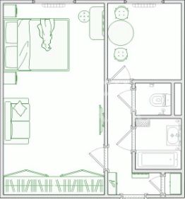 Квартира с функциональной планировкой: общая площадь - 32,5 кв. м, жилая комната - 20 кв. м, кухня - 7 кв.м, раздельный СУ, высота потолков — 2,65 метра.