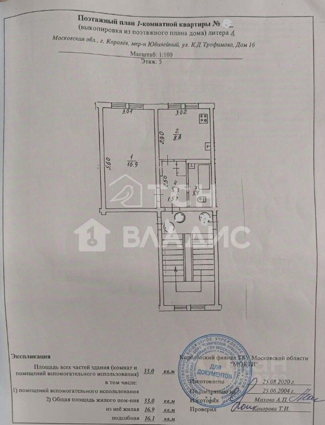 Квартира расположена на 5 этаже 5-этажного панельного дома 1961 года постройки. Общая площадь составляет 33 кв. м, из которых 16,9 кв. м — жилая площадь, 8,8 кв. м — кухня. Высота потолков — 2,7 м.