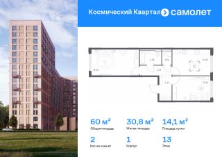Строим кварталы для жизни с заботой о будущем. Предлагается 2-комнатная квартира комфорт-класса 60,03 кв.м в корпусе 1 на 13 этаже, в ЖК "Космический Квартал"