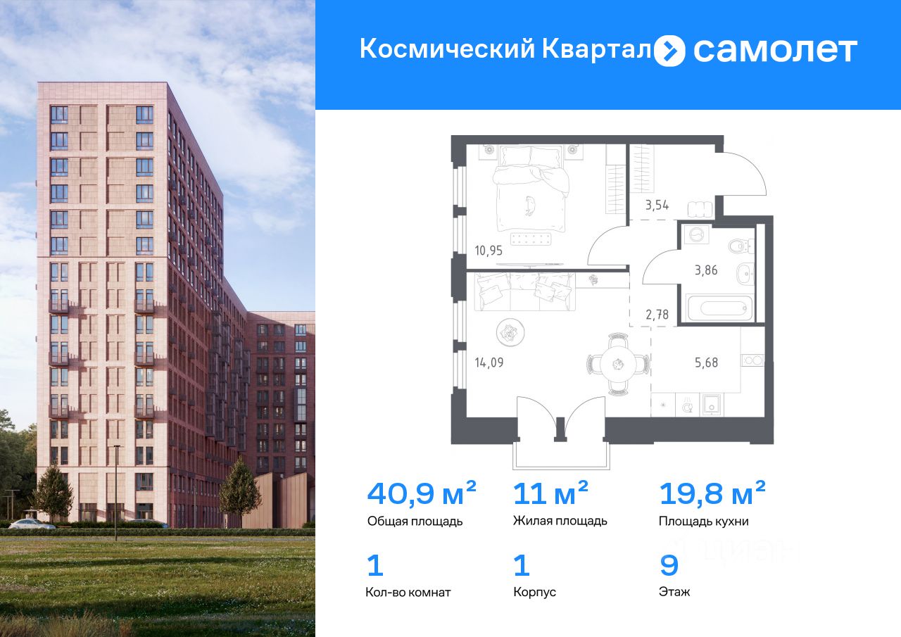 Строим кварталы для жизни с заботой о будущем. Предлагается 1-комнатная квартира комфорт-класса 40,9 кв.м в корпусе 1 на 9 этаже, в ЖК "Космический Квартал"