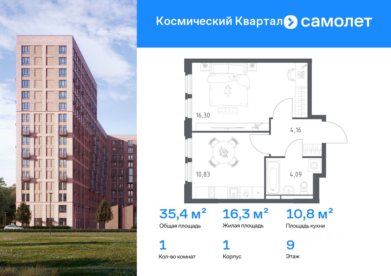 Строим кварталы для жизни с заботой о будущем. Предлагается 1-комнатная квартира комфорт-класса 35,38 кв.м в корпусе 1 на 9 этаже, в ЖК "Космический Квартал"