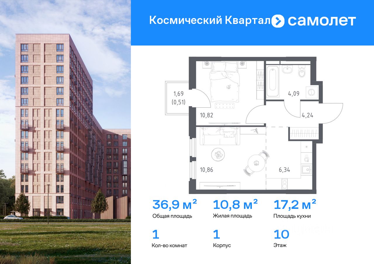 Строим кварталы для жизни с заботой о будущем. Предлагается 1-комнатная квартира комфорт-класса 36,86 кв.м в корпусе 1 на 10 этаже, в ЖК "Космический Квартал"