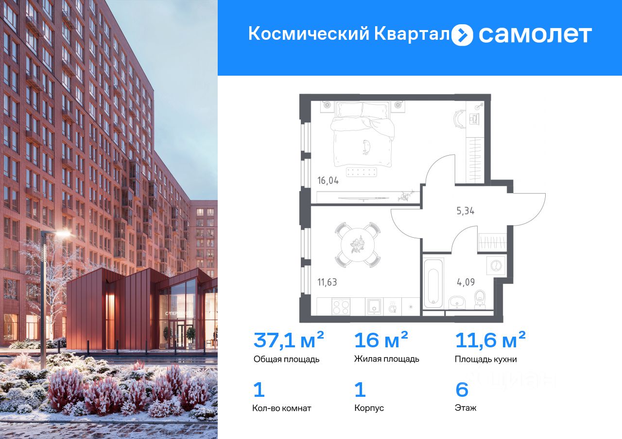 Строим кварталы для жизни с заботой о будущем. Предлагается 1-комнатная квартира комфорт-класса 37,1 кв.м в корпусе 1 на 6 этаже, в ЖК "Космический Квартал"
