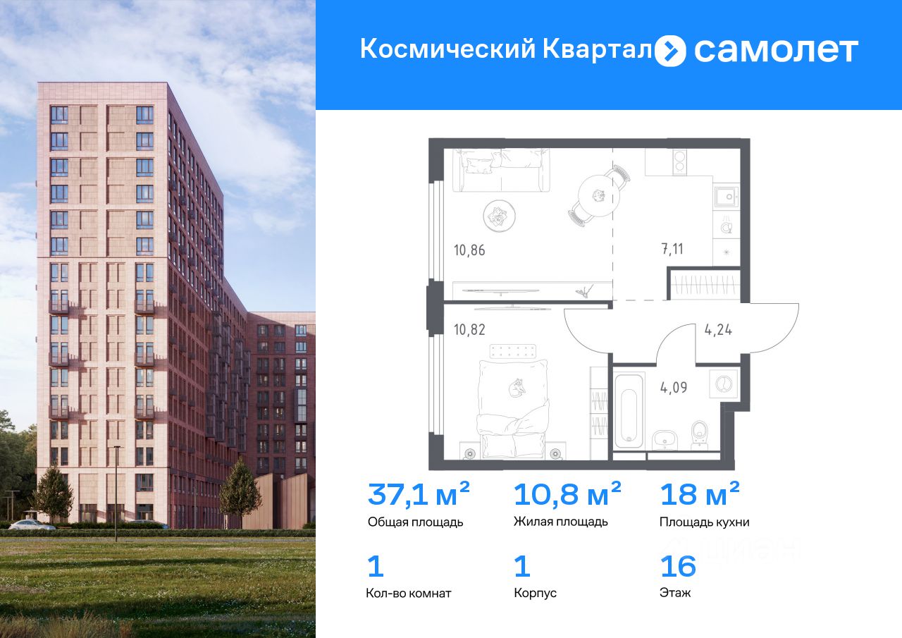 Строим кварталы для жизни с заботой о будущем. Предлагается 1-комнатная квартира комфорт-класса 37,12 кв.м в корпусе 1 на 16 этаже, в ЖК "Космический Квартал"