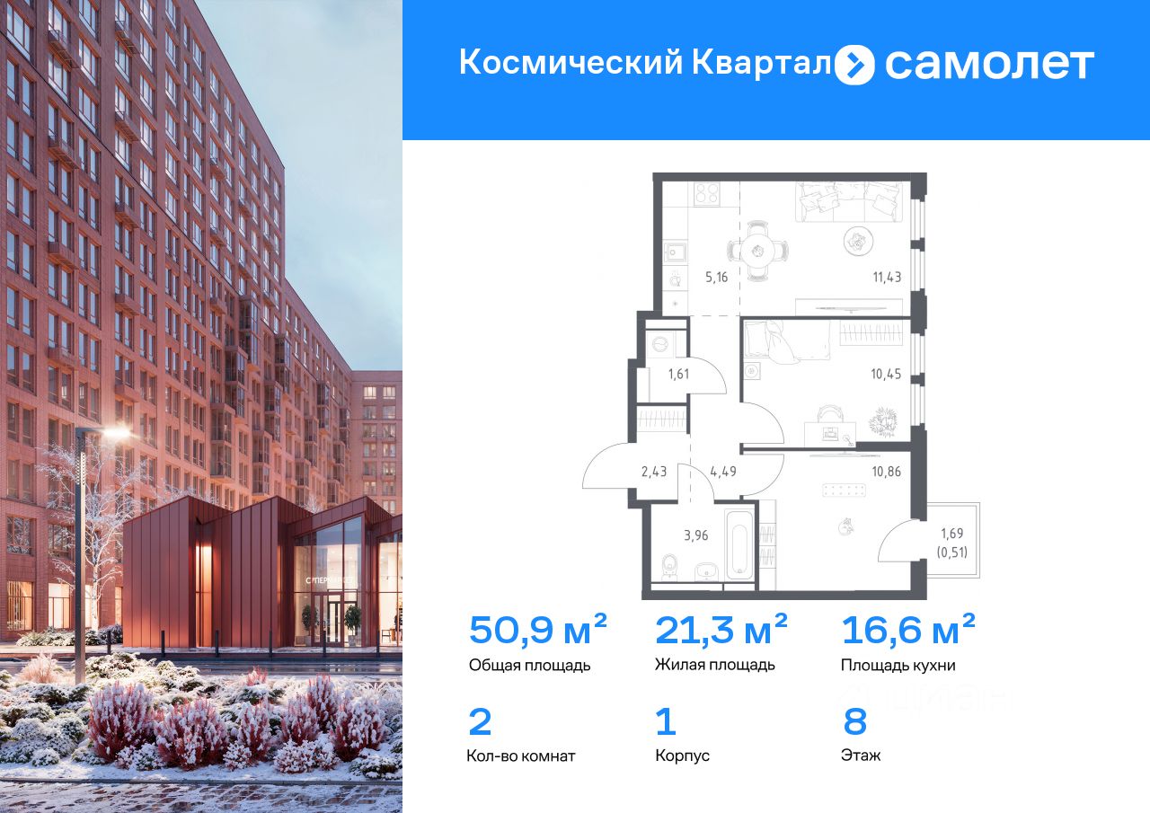 Строим кварталы для жизни с заботой о будущем. Предлагается 2-комнатная квартира комфорт-класса 50,9 кв.м в корпусе 1 на 8 этаже, в ЖК "Космический Квартал"