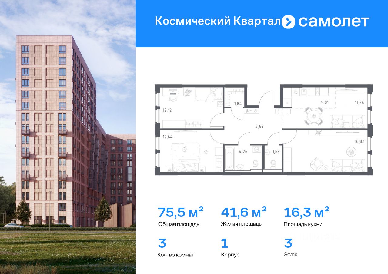 Строим кварталы для жизни с заботой о будущем. Предлагается 3-комнатная квартира комфорт-класса 75,49 кв.м в корпусе 1 на 3 этаже, в ЖК "Космический Квартал"