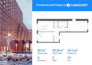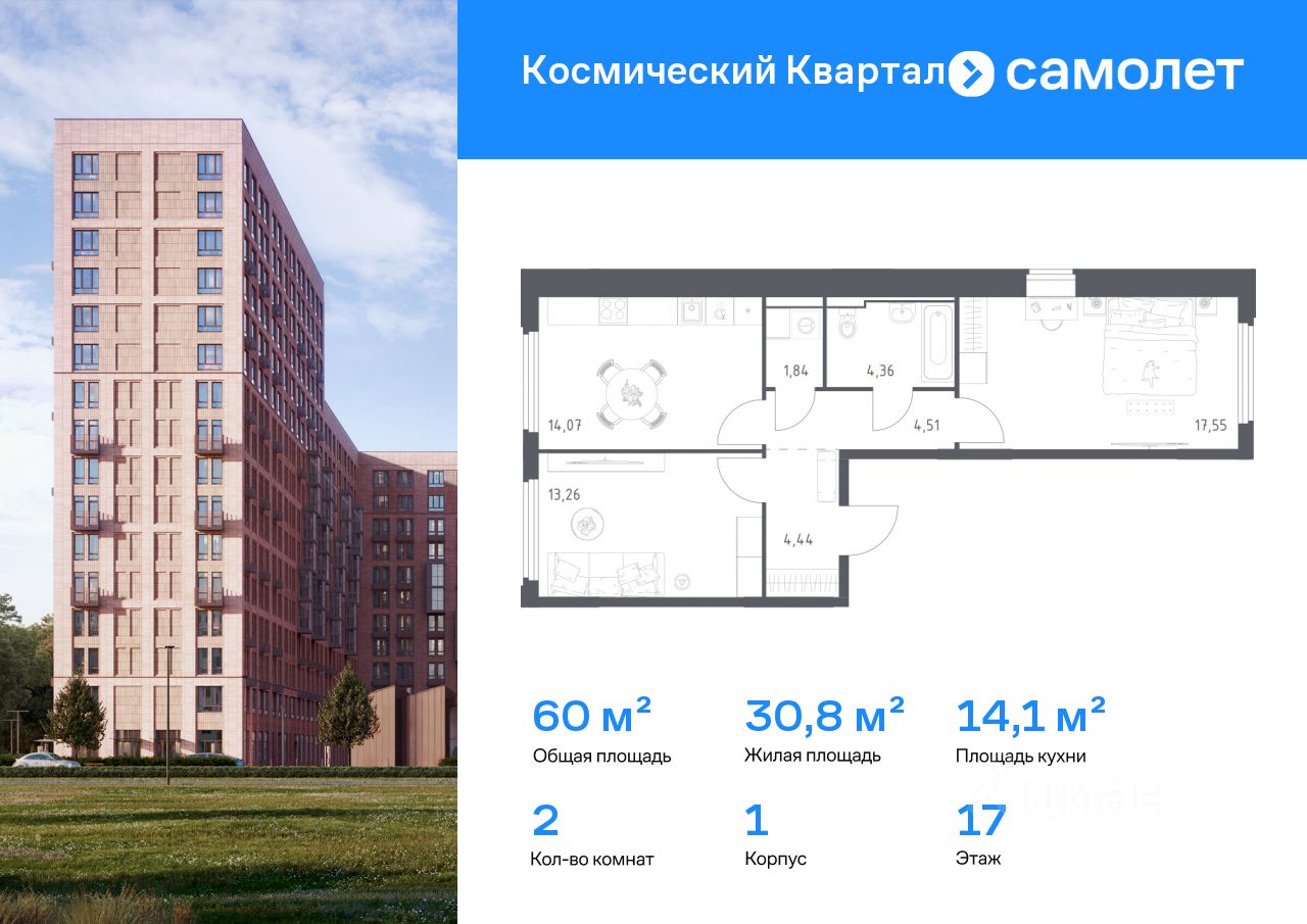 Строим кварталы для жизни с заботой о будущем. Предлагается 2-комнатная квартира комфорт-класса 60,03 кв.м в корпусе 1 на 17 этаже, в ЖК "Космический Квартал"