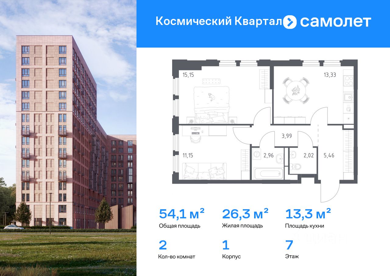 Строим кварталы для жизни с заботой о будущем. Предлагается 2-комнатная квартира комфорт-класса 54,06 кв.м в корпусе 1 на 7 этаже, в ЖК "Космический Квартал"