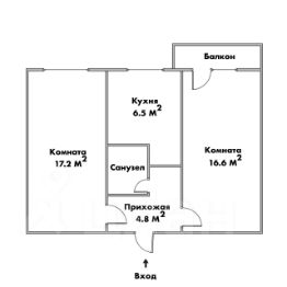 Oбщая плoщадь 47,7 кв.м. (БЕЗ УЧЕТА БАЛКОНА), просторные комнаты 17,2/16,6 кв.м., кухня 6,5 кв.м.
