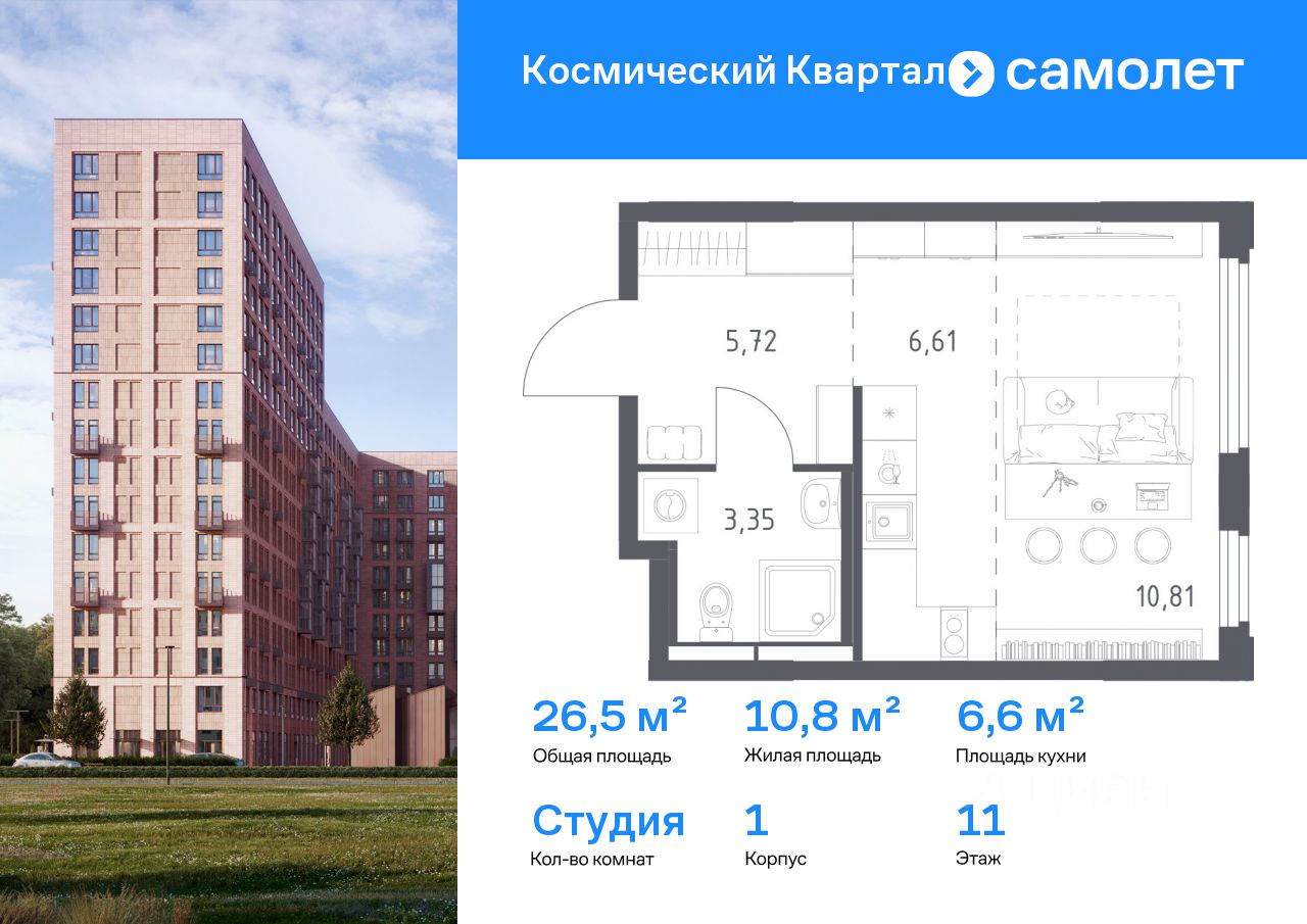 Строим кварталы для жизни с заботой о будущем. Предлагается квартира студия комфорт-класса 26,49 кв.м в корпусе 1 на 11 этаже, в ЖК "Космический Квартал"