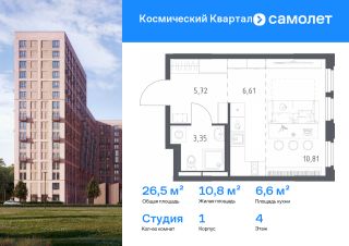 Строим кварталы для жизни с заботой о будущем. Предлагается квартира студия комфорт-класса 26,49 кв.м в корпусе 1 на 4 этаже, в ЖК "Космический Квартал"