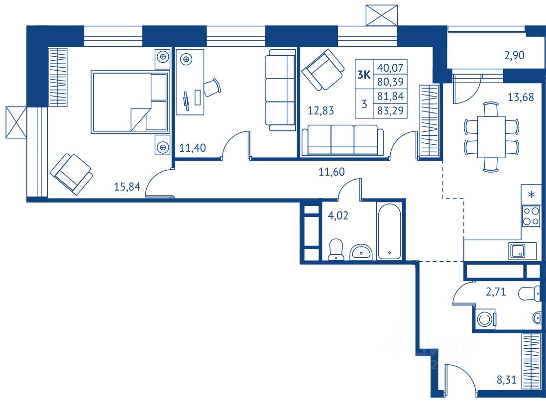 Продаётся 3-комнатная квартира в строящемся доме (Дом 1), срок сдачи: II-кв. 2028, общей площадью 80.39 кв.м., на 3 этаже. Жилой комплекс "Поколение Первых" - новый проект от ГК "Профи Инвест", осуществляющей деятельность на рынке жилой недвижимости более 15 лет (построено более 1 млн. кв. метров жилья).