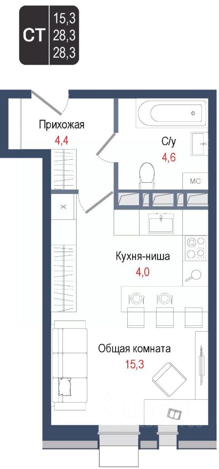 Продается квартира-студия 80 в строящемся ЖК "КИНОКВАРТАЛ", Корпус 1. Квартира расположена на 5 этаже, общая площадь 28,3 кв.м.