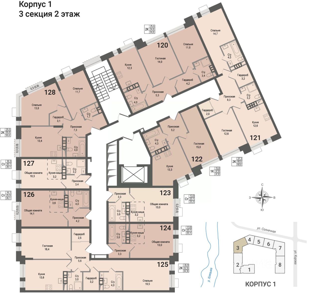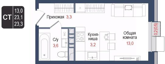 Продается квартира-студия 123 в строящемся ЖК "КИНОКВАРТАЛ", Корпус 1. Квартира расположена на 2 этаже, общая площадь 23,1 кв.м.