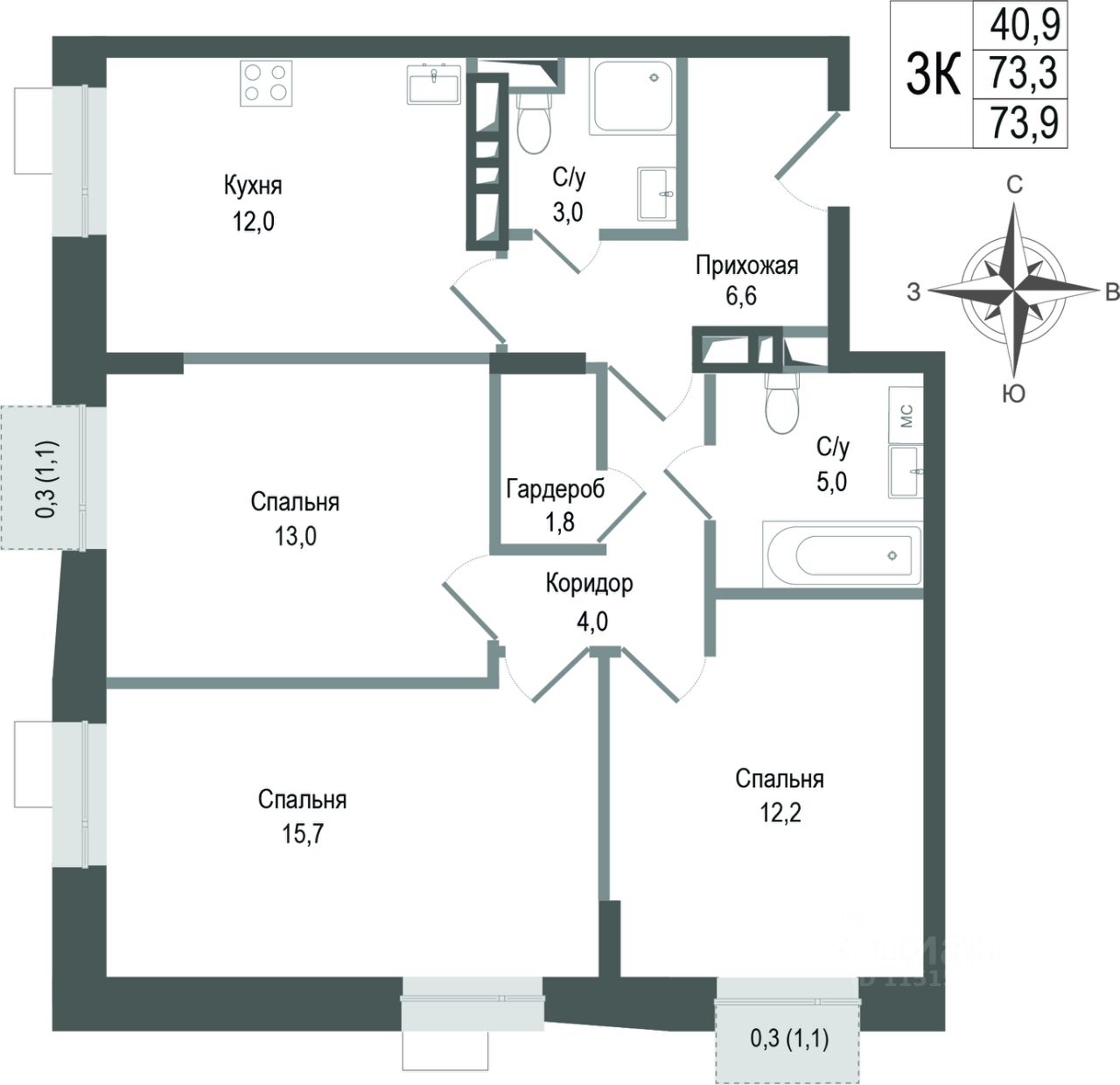 Продаётся 3-комнатная квартира в строящемся доме (Корпус 2), срок сдачи: II-кв. 2027, общей площадью 73.3 кв.м., на 4 этаже. ЖК "Киноквартал" , МО, г. Королев, мкр. Первомайский, ул. Солнечная, д. 2