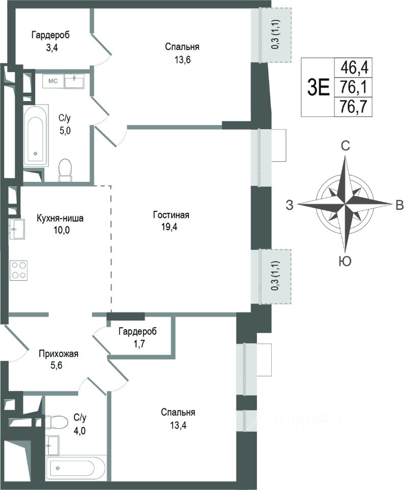 76,1 м²